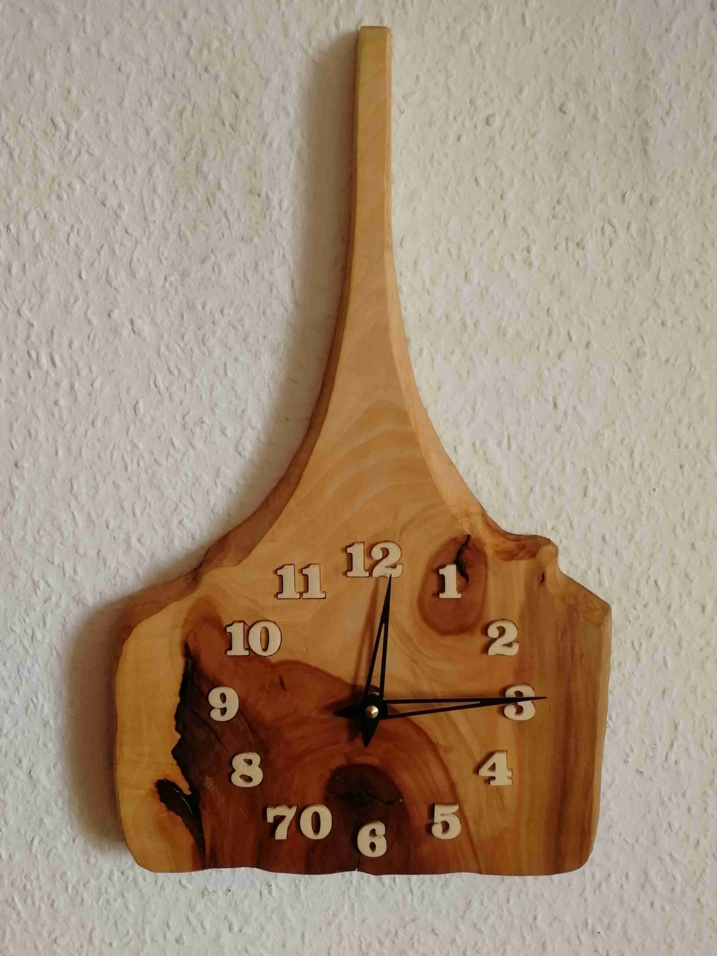 Ilustrační obrázek se zafrézovaným ciferníkem hodin a vkládanými číslicemi z jiného druhu dřeva